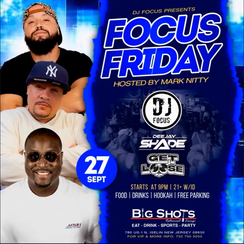 Focus Friday Friday, September 27 @ 9pm Hosted by: Mark Nitty DJ Focus | DJ Shade | Get Loose Food | Drinks | Hookah | Free Parking | 21+ + Add to Google Calendar + iCal / Outlook export The event is finished. Date Sep 27 2024 Expired! Time 9:00 pm Share this event Search for: